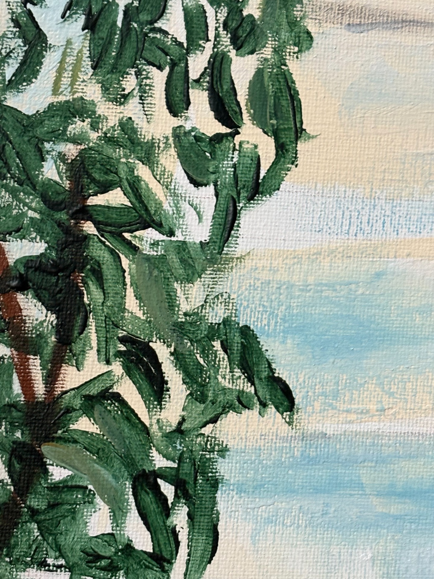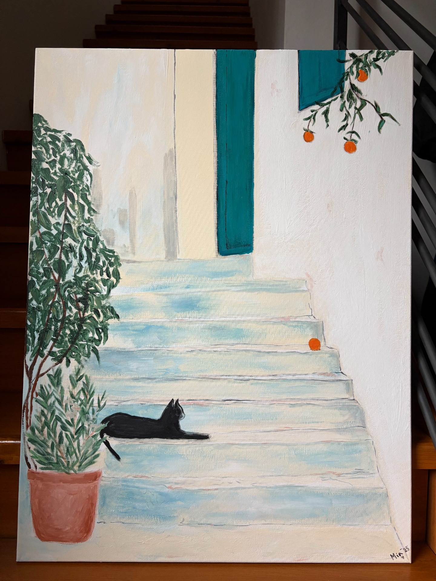 Heat, gentle breeze, the smell of the sea and oranges. Silence. A moment just for yourself. A moment of eternity. Acrylic, canvas, 40x50 cm, varnished, signed 2025