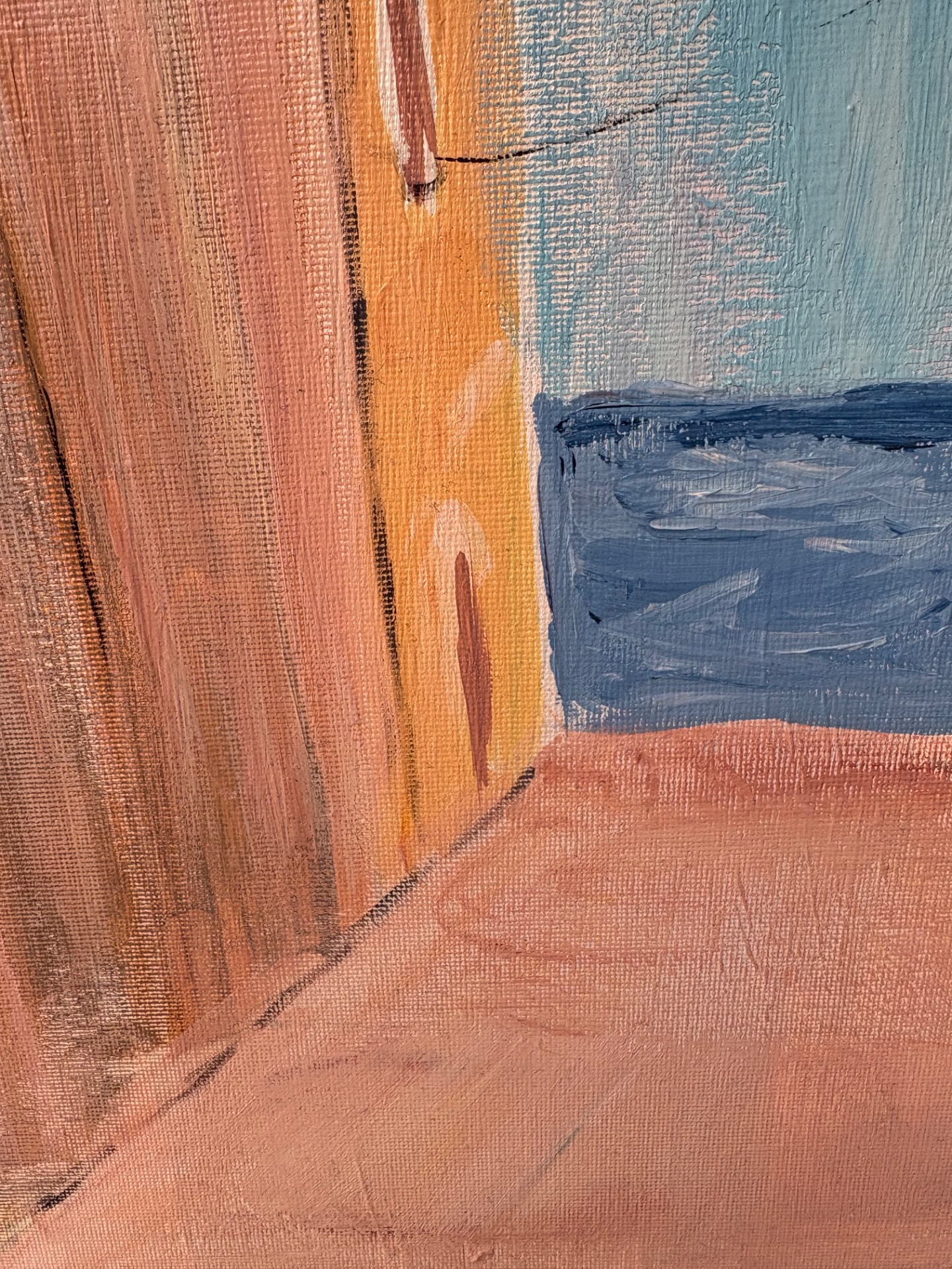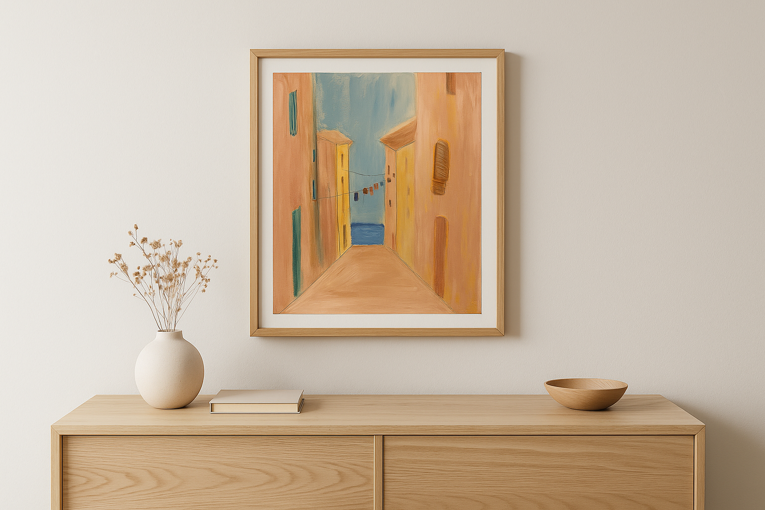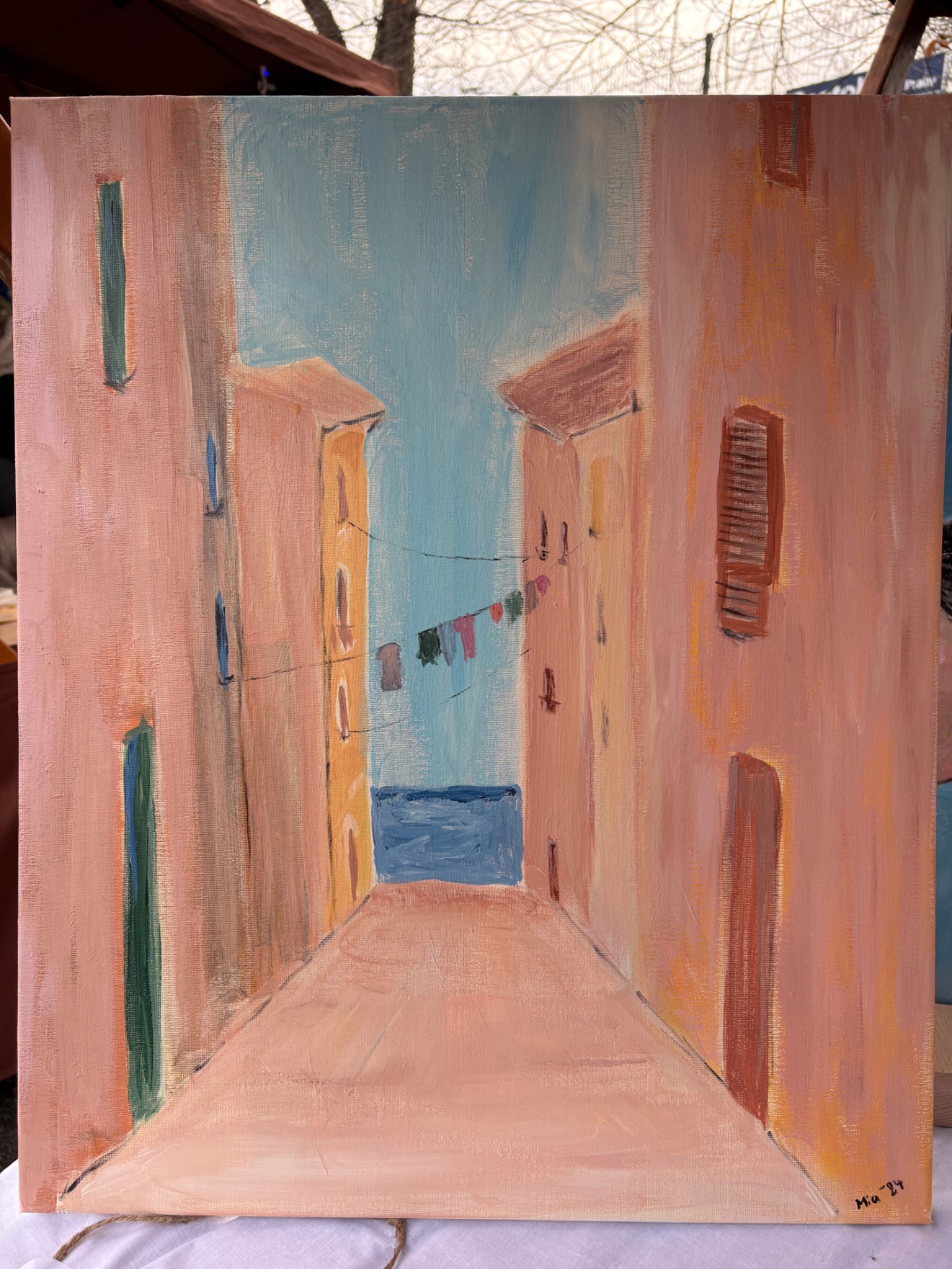 Jasné nebe, z oken je slyšet prostírání nádobí na stůl k polednímu obědu a v dálce šumí moře. Ten moment nicnedělání. Akryl , plátno na borovicovém rámu, 50x60cm, ošetřeno lakem, signováno 2024.