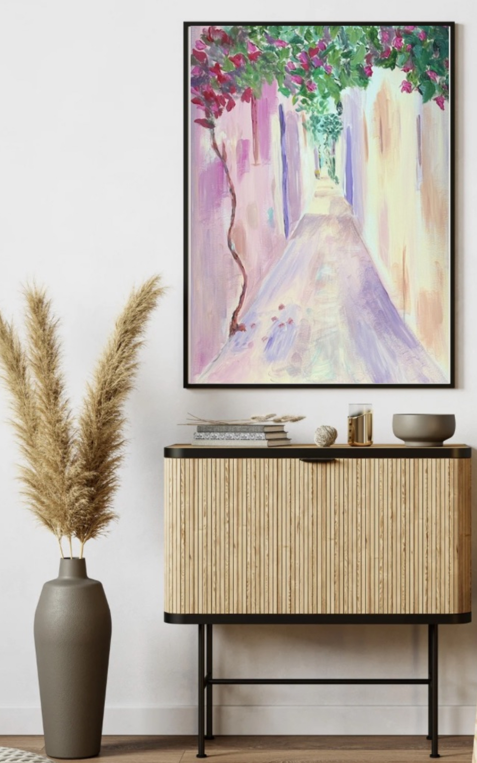 Barvy, snová atmosféra, situace, která probouzí zvědavost. Co je za dveřmi? Je to klid nebo začátek příběhu? Lehkÿ surrealismus v sytých snovÿch barvách. Doslova rozzáří prostor.